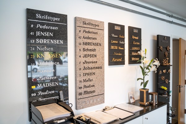 Det er ikke altid at vejrliget er med en, når der skal ses på gravsten. Derfor tilbyder Danske Stenhuggerier i Frederikshavn muligheden for at se på gravsten indendørs i en spændende og nyskabende udstilling. Få en samtale med Morten, der rådgiver om de mange muligheder, og få udført et digitalt billede af inskription og sten, inden den endelige beslutning træffes.