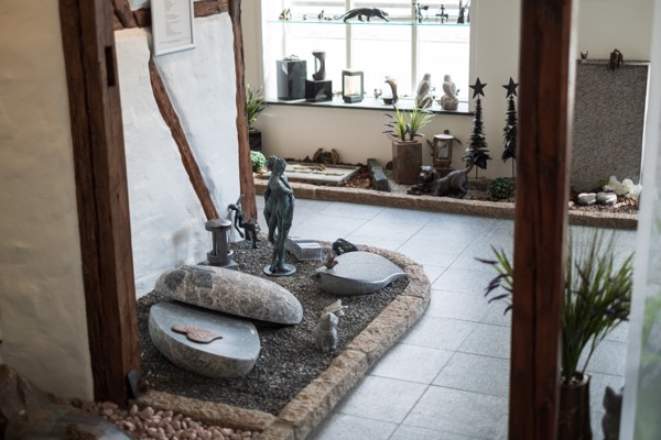 Hos stenhuggeren kan du også få inspiration til øvrig udsmykning af gravstedet. Her findes udvalg af bronzeartikler, trædesten, fuglebade, lanterner, vaser og meget mere. Oplev de mange muligheder i den inspirerende indendørsudstilling.