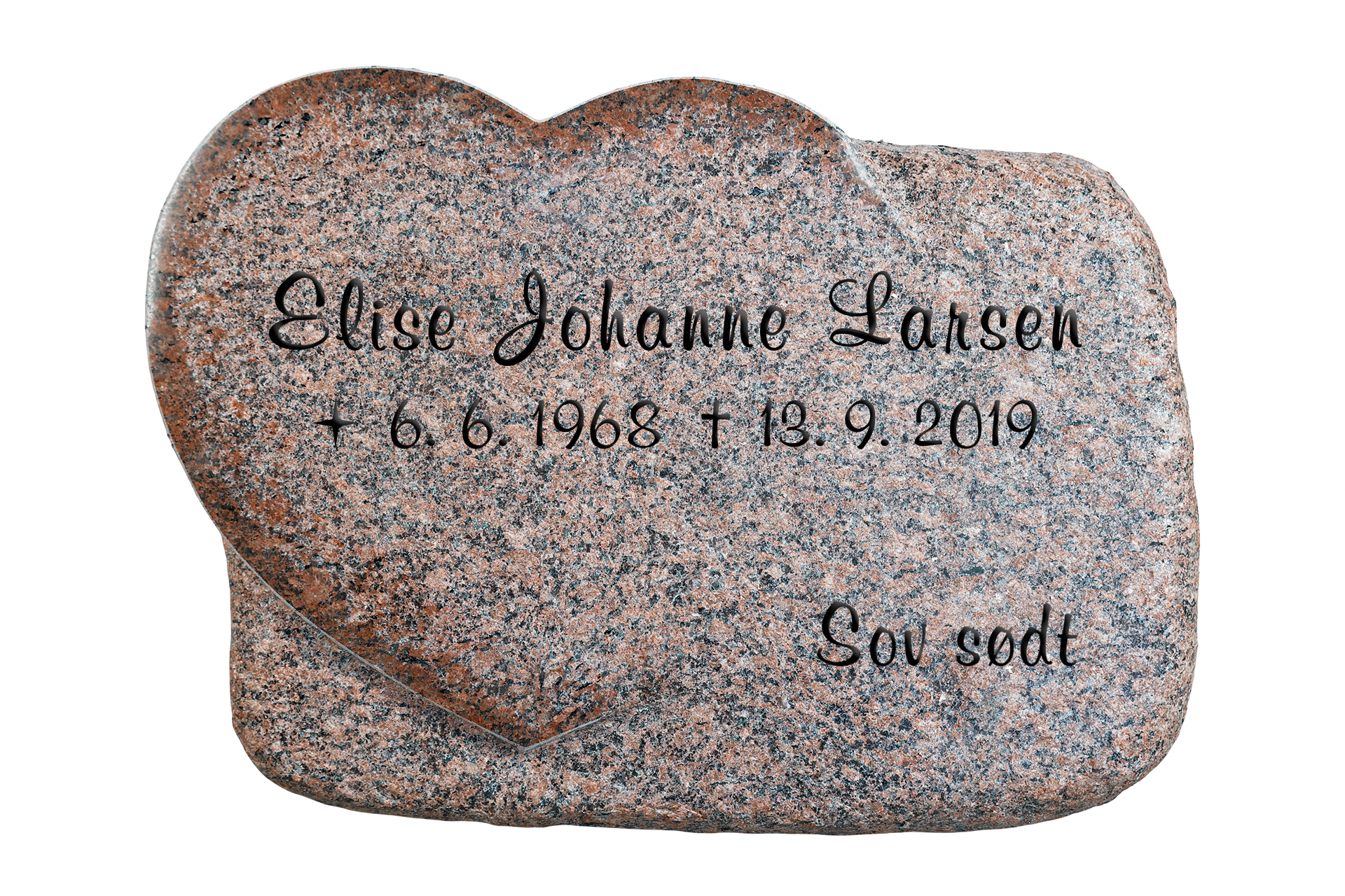 Gravsten med hjerte i svensk Vånga granit. Mål 60 x 40 cm.