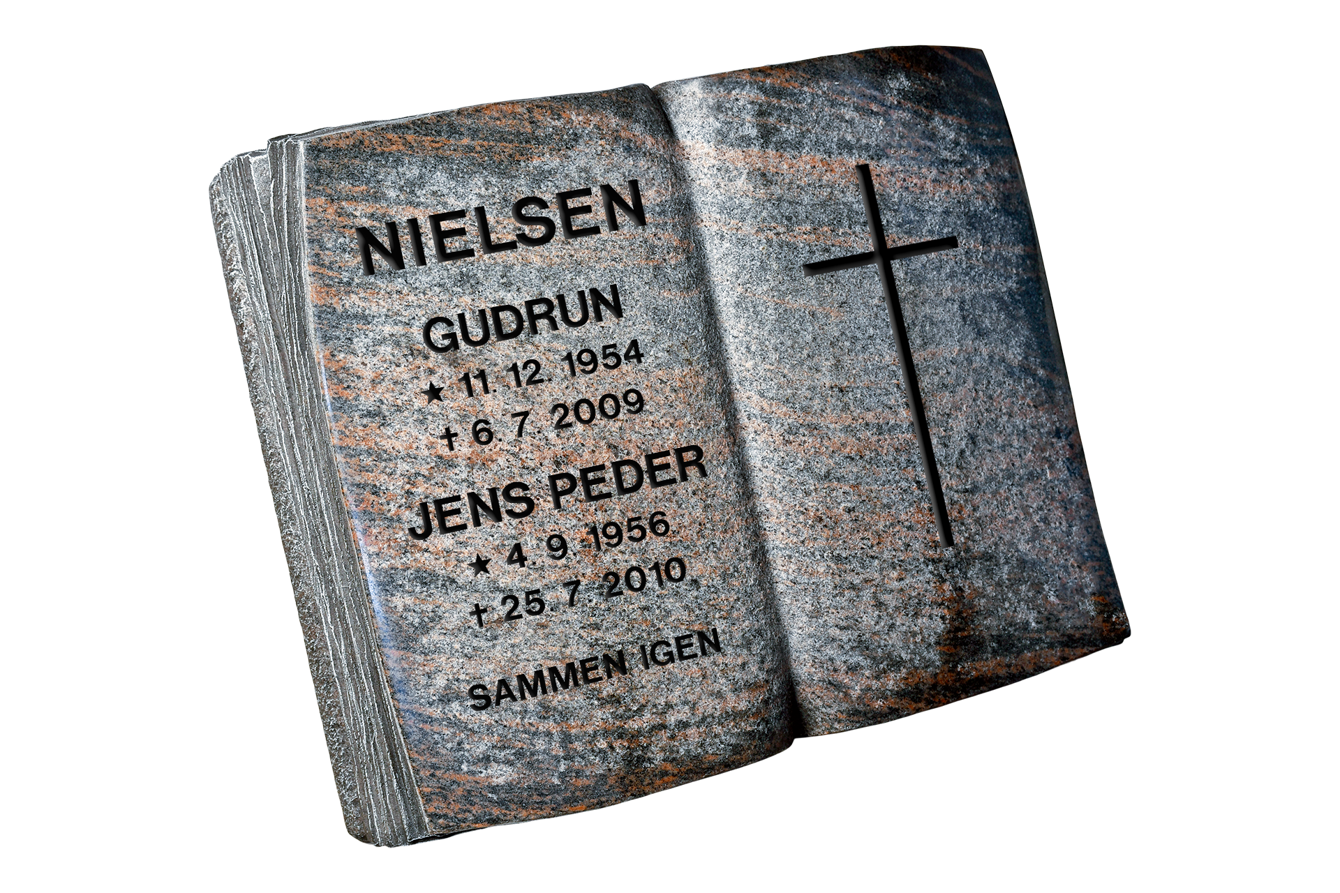 Gravsten udformet som bog i svensk Halmstad granit. Mål 60 x 40 cm.