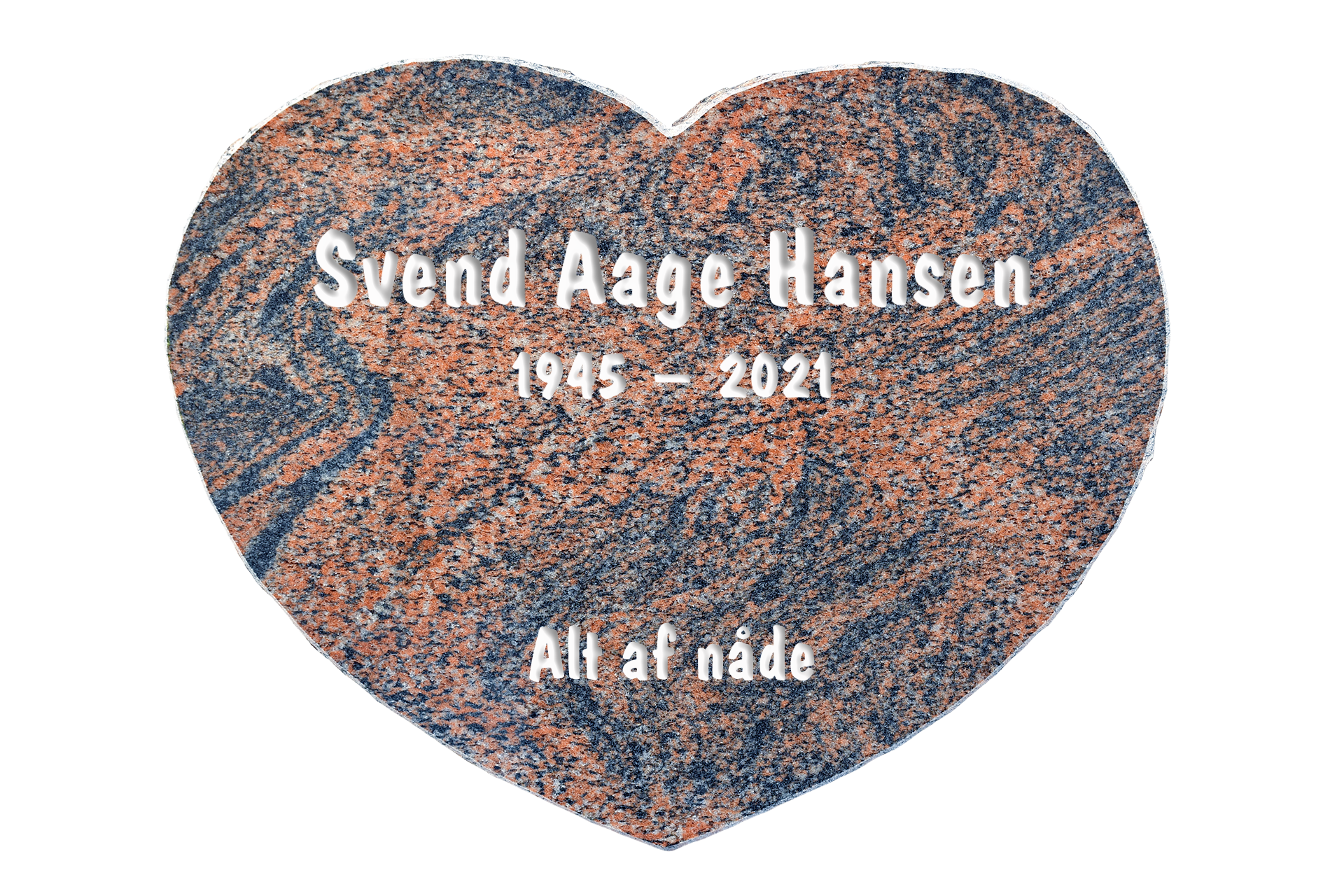 Gravsten i hjertefacon udført i svensk Halmstad granit. Mål 50 x 40 cm.