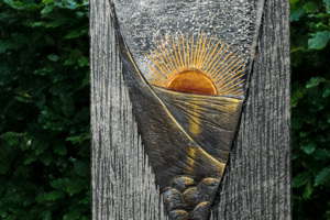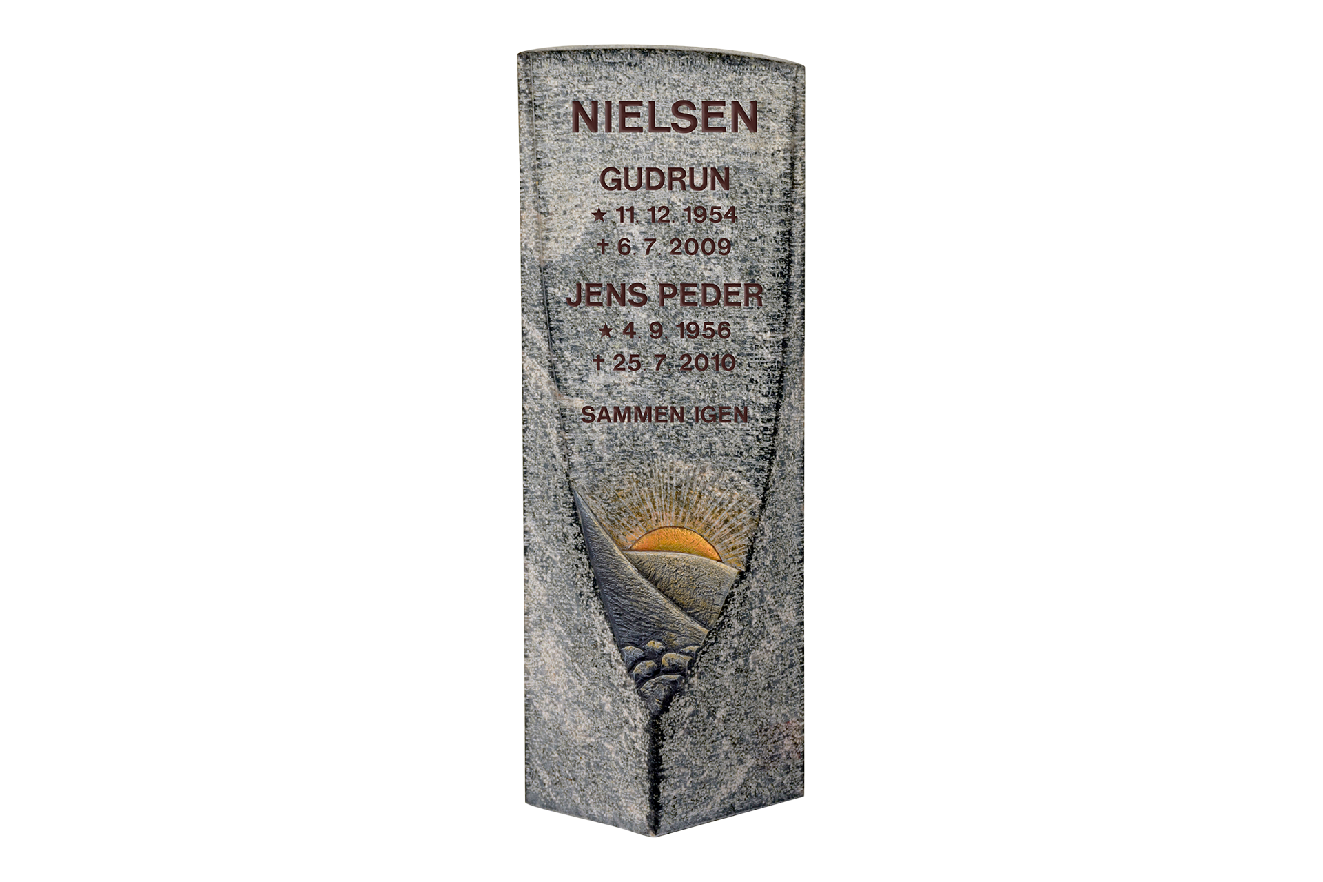 Unika gravsten i bornholmsk Paradis granit. Solnedgangs dekoration indhugget i stenen.