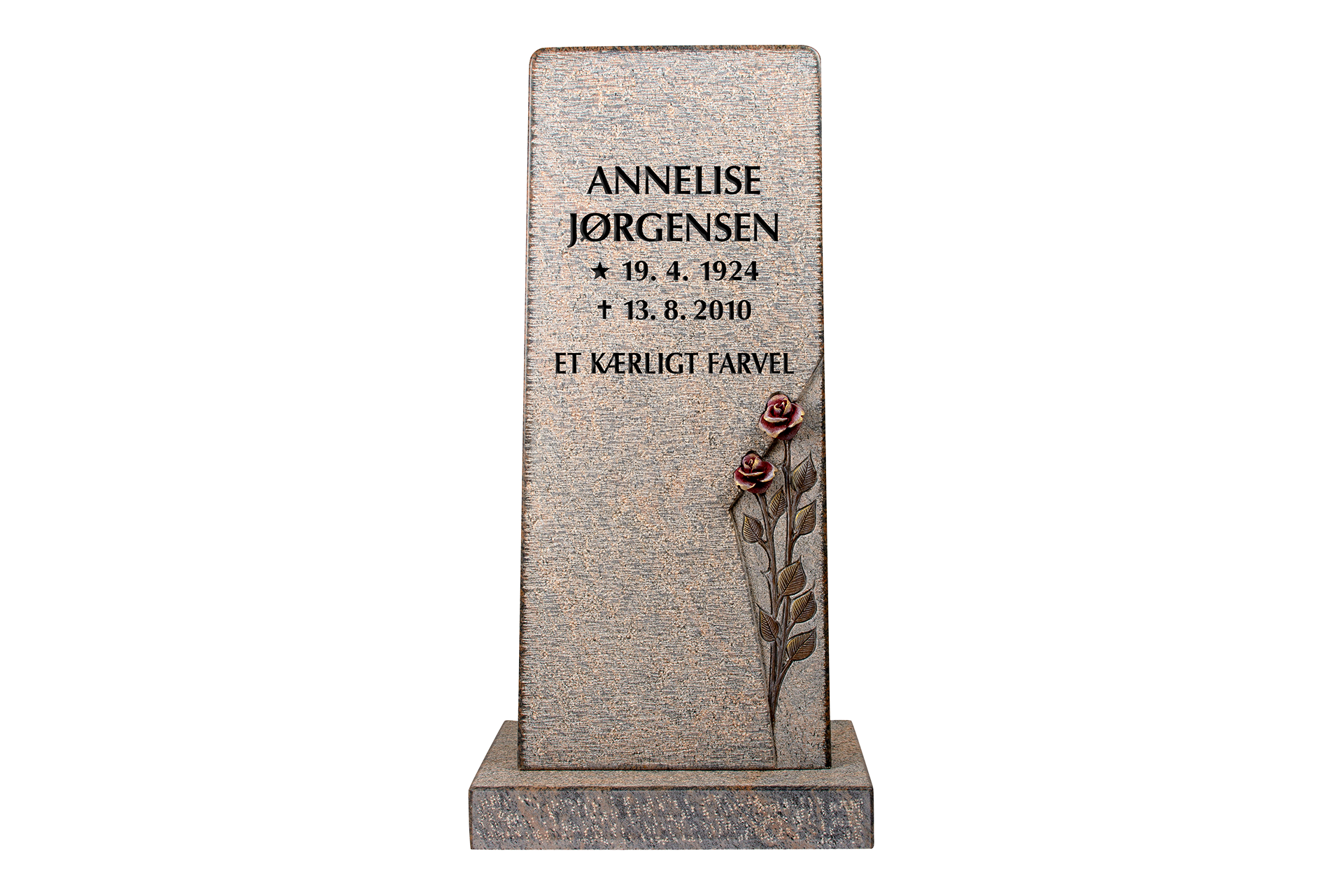 Unika gravsten i svensk Halmstad granit. Stelefacon med sokkel og special indhugget rose.